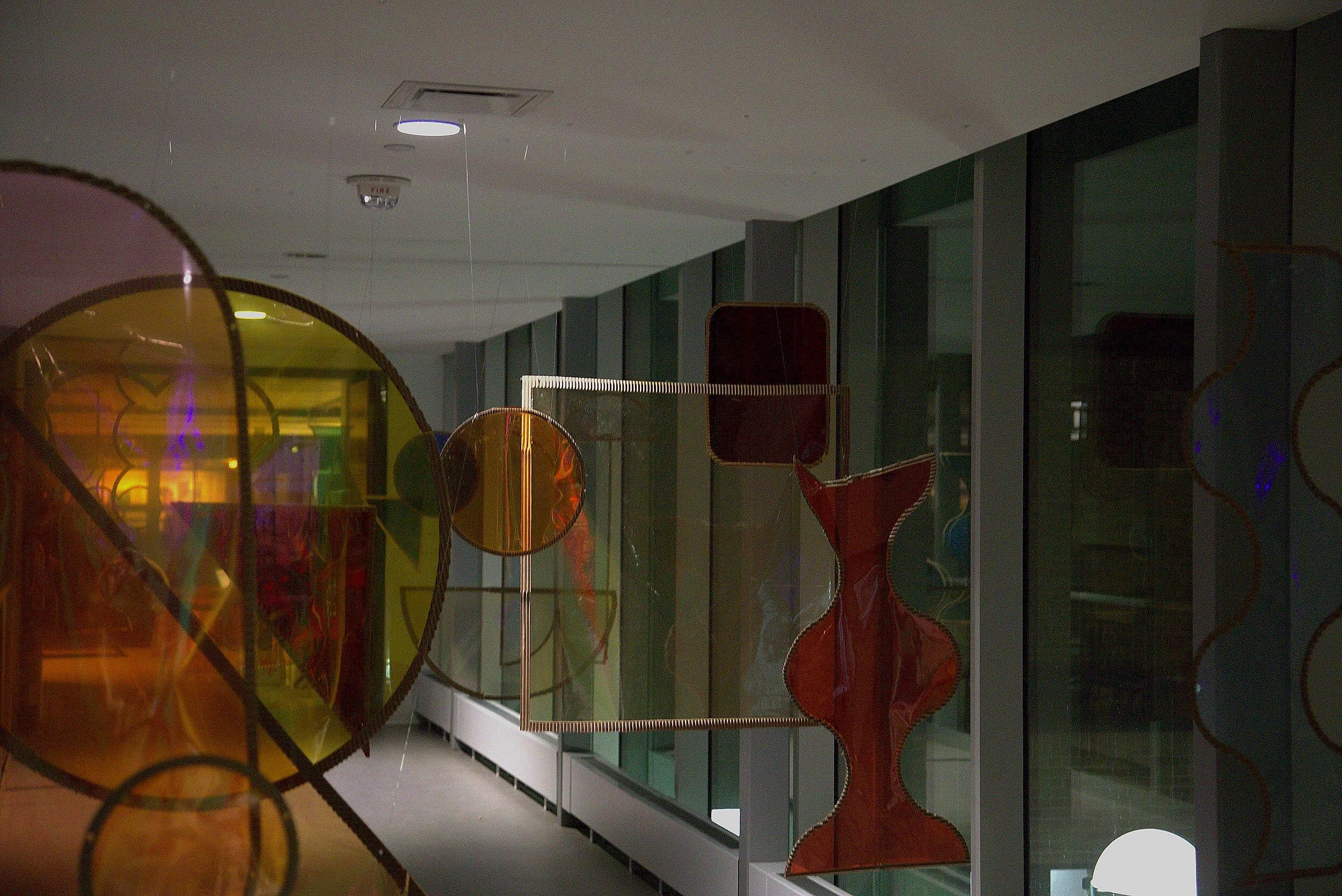 The Taubman College of Architecture and Urban Planning at the University of Michigan holds a student-run ball each year where people can volunteer to create an installation. Chromatic suspension is an installation made in collaboration with Rowan Freeman and Milcah Kresnadi. The installation includes camera gels in different shapes and at different heights that form a path for the guest to move through and look through the different colors.